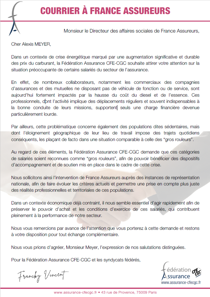 CFE CGC – Courrier à France Assureurs9 avril 2026Equipe communication CFE CGC LA MONDIALENews des sites de Paris, News du réseau, News du site de MonsArticles connexes INTERESSEMENT 2025 : tous les chiffresPour cette année, certains critères déclenchants, (qualité opérationnelle, Plateformisation, Satisfaction client, RSE…) impactent ce dernier.… Arrêt de travail et droit à Congés Payés : La date limite approche Pour rappel, de nouvelles règles légales sont entrées en vigueur le 24 avril 2024. Le texte… NAO 2026 : L’action collective prend de l’ampleur ! Signez la pétition.Suite à l'assemblée générale de toutes les organisations syndicales du groupe le 9 février qui…